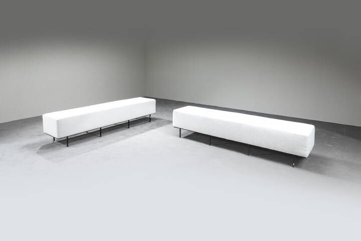 Coppia di grandi panche con imbottitura rivestita in tessuto e sostegni in metallo [..]