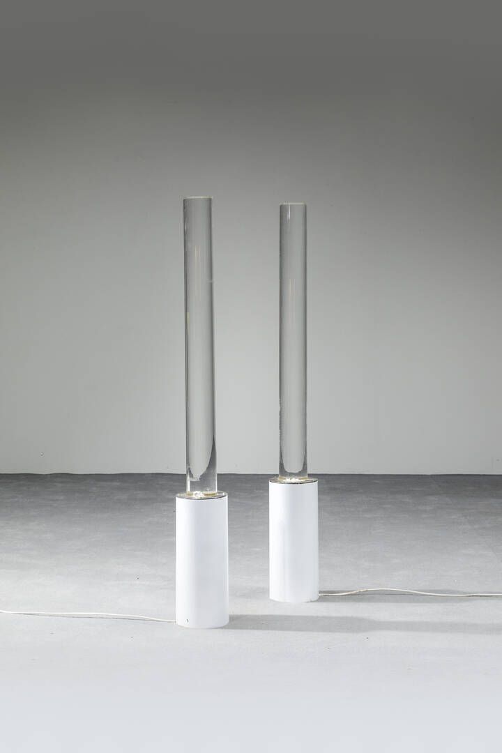 Coppia di lampade da terra in metallo verniciato e plexiglass. Anni '60 h cm 123x15 [..]