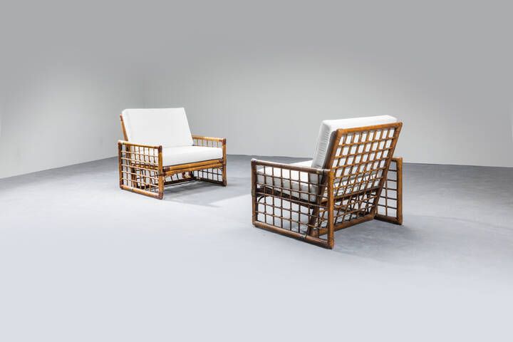 Coppia di poltrone con struttura in bamboo legature in cuoio particolari in ottone [..]
