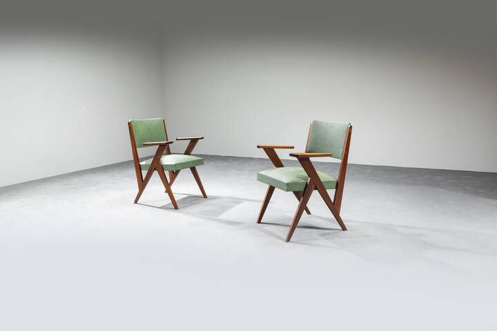 Coppia di poltrone in legno seduta e schienale rivestito in tessuto. Anni '50 [..]