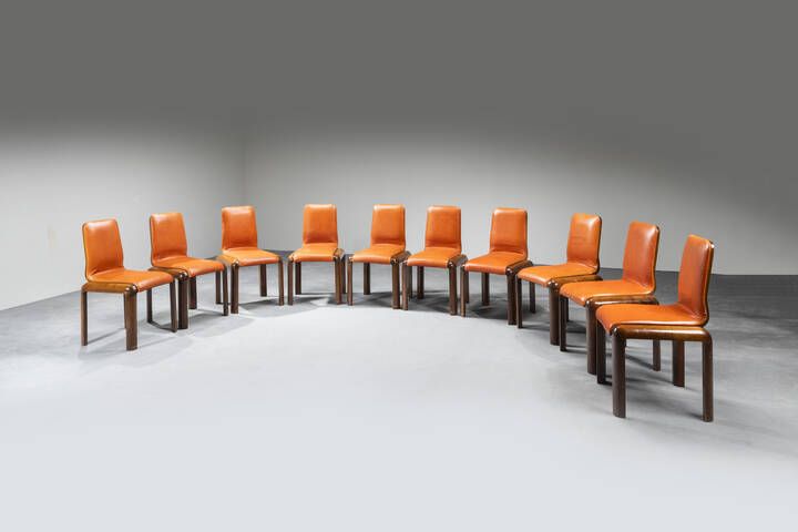 Dieci sedie con struttura legno e seduta imbottita rivestita in pelle. cm 87x47x50 [..]