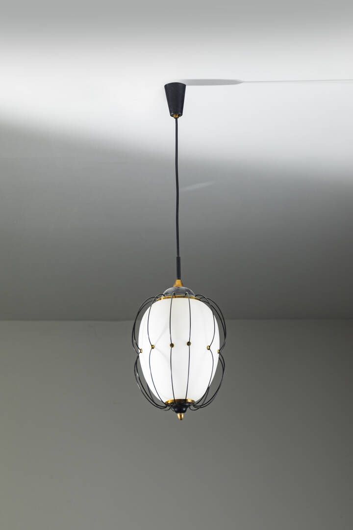 Struttura in metallo verniciato diffusore in vetro satinato e particolari in ottone. Anni '50 h cm 90x23