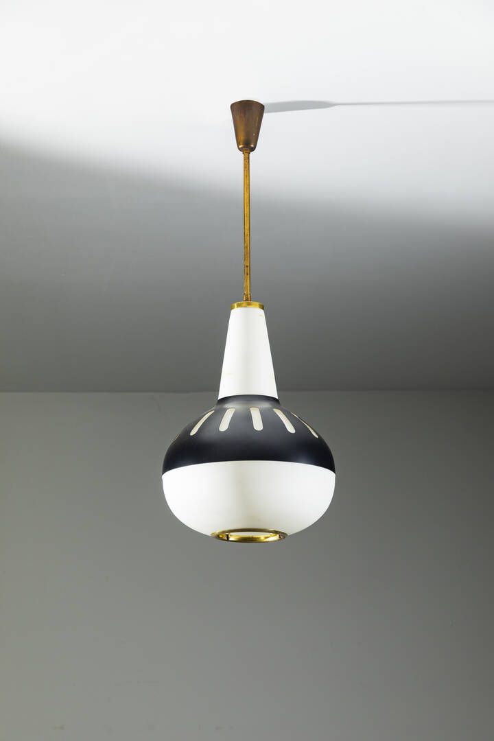 Struttura in ottone metallo verniciato e diffusore in vetro opalino. Prod. Fontana Arte anni '60 h cm 95x35 Bibl.: Quaderni Fontana Arte n.6 Difetti