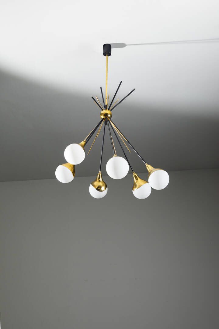 Struttura in ottone e metallo diffusori in vetro satinato. Prod. Stilnovo anni '50 h cm 100x78