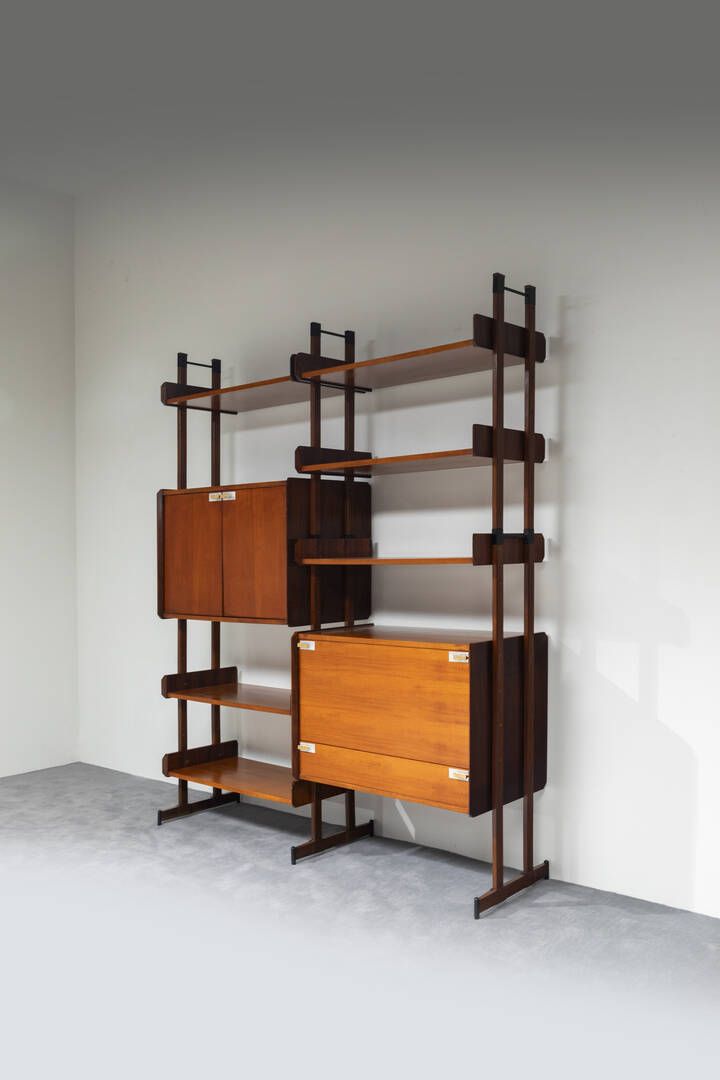 Libreria modulare a due campate in legno particolari in metallo verniciato e ottone. Anni '70 cm 204 5x165x47 Piccoli difetti