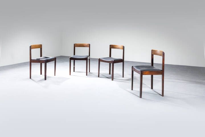 Quattro sedie con struttura in legno seduta imbottita rivestita in pelle. Prod. Tredici anni '60 cm 77x46x47