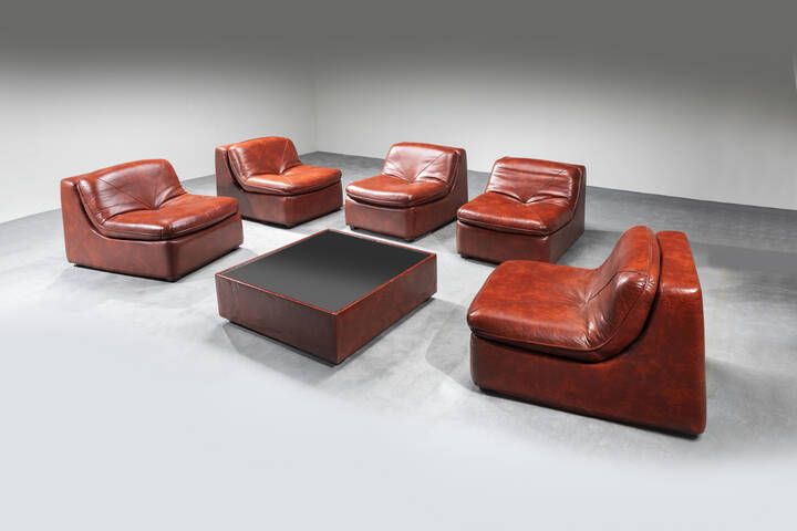 Salotto composto da cinque poltroncine rivestite in pelle e piedini in plastica tavolino in pelle con piano specchiato. Anni '70 poltroncina cm 70x74x95 tavolino cm 30x88 5x88 5 Piccoli difetti