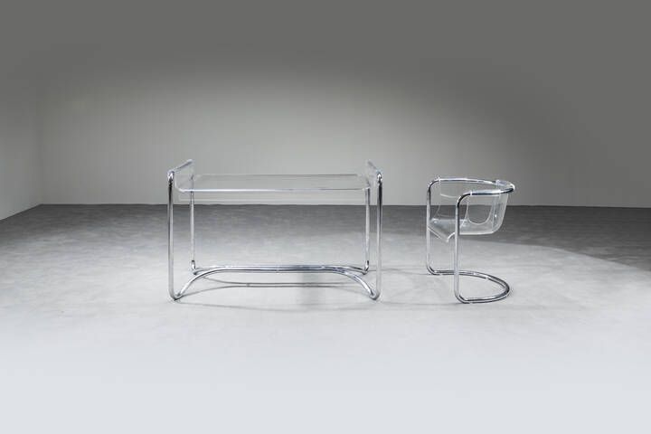 Struttura in acciaio piano e seduta in plexiglass. Anni '80 scrivania cm 82 5x32 5x67 sedia cm 72x62x50 Difetti