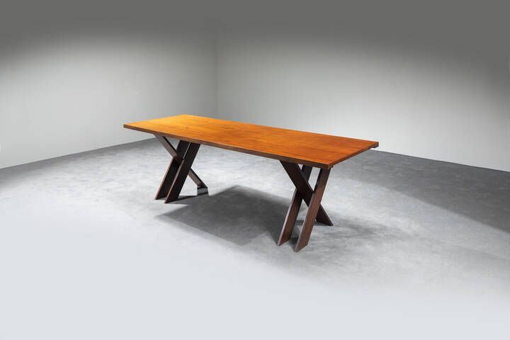 Struttura in legno e piano in panforte. Prod. Poggi anni '70 cm 72x220x76 Bibl.: Giuliana Gramigna Repertorio 1950-2000 Mondadori 1985 p. 400 Difetti