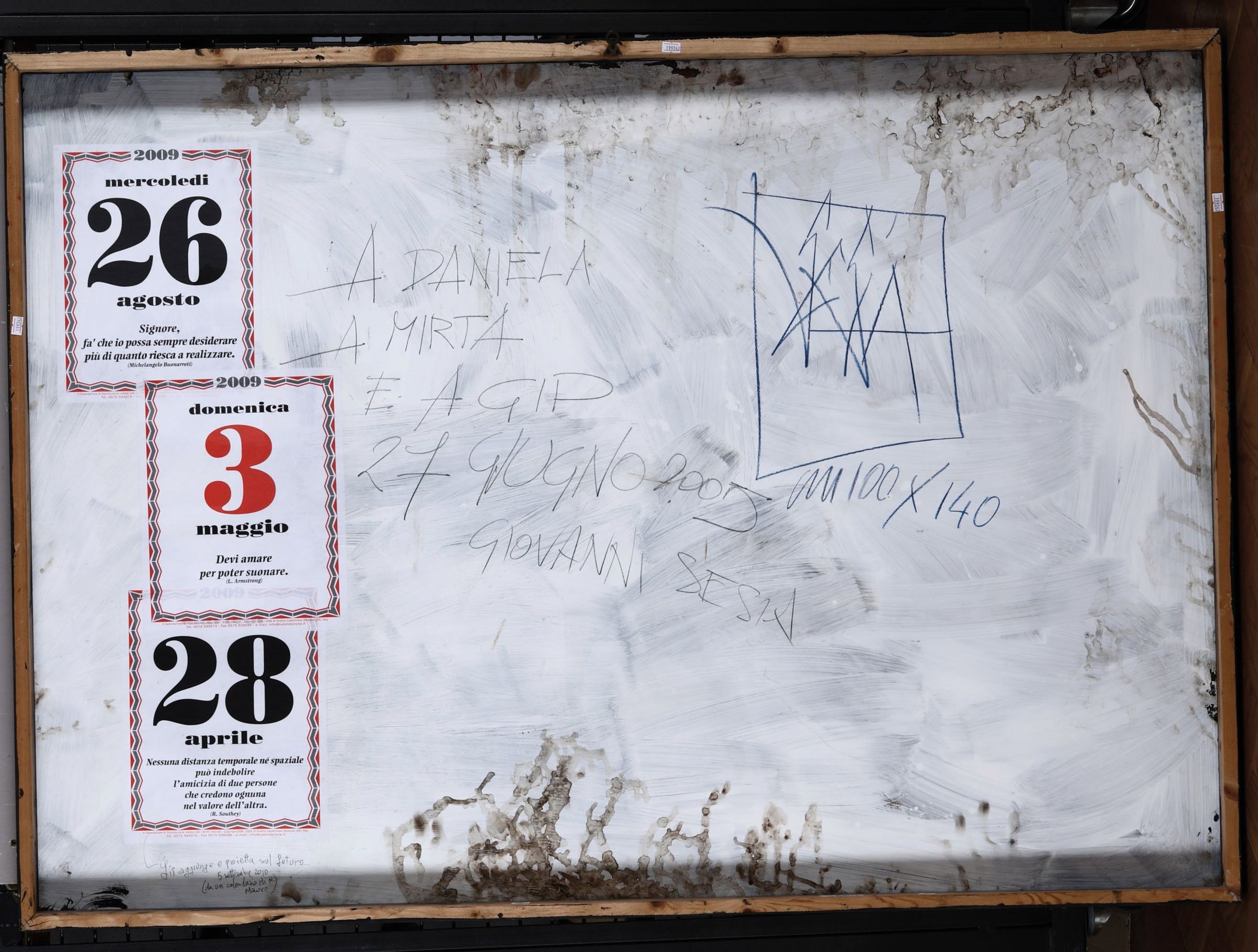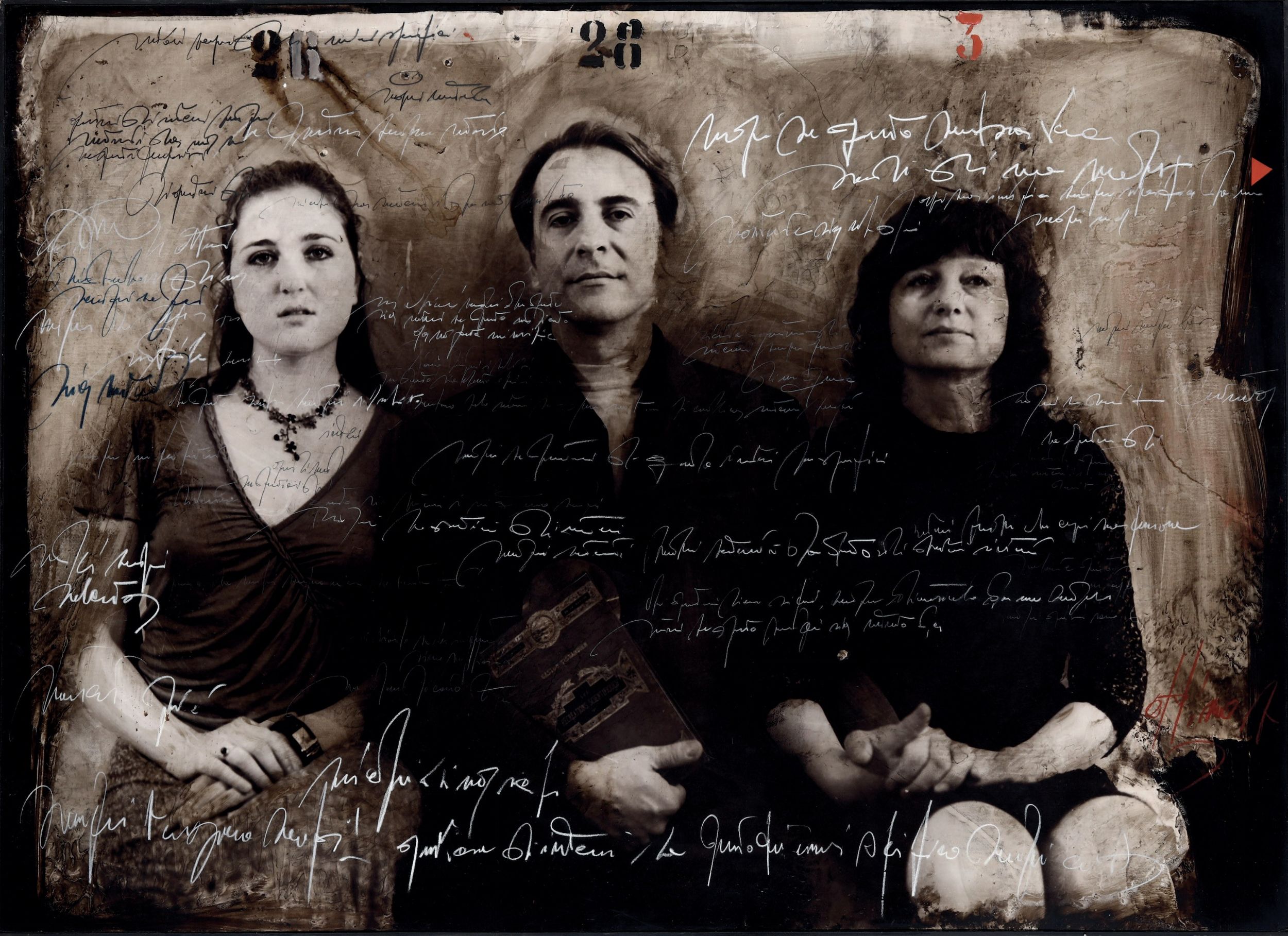 pittura e scritture su carta fotografica impressa da lastra originale, incollata su legno, Largh. 140 - Alt. 100 cm