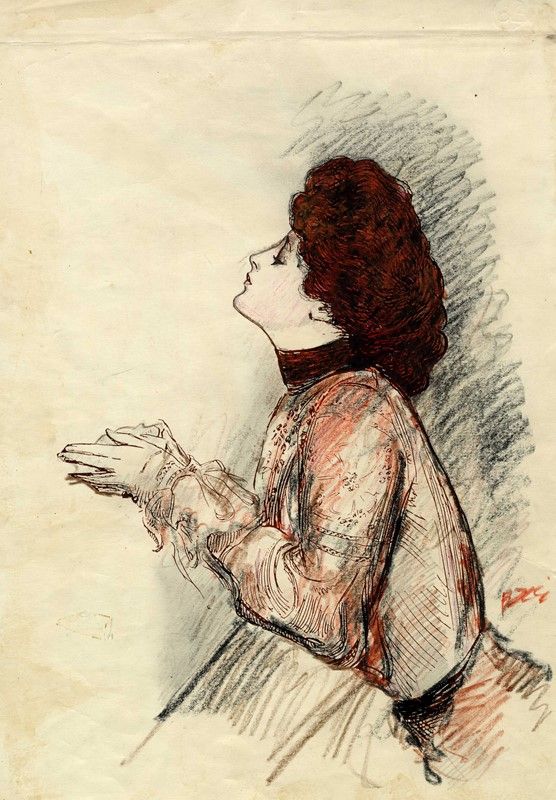 Penna e inchiostro di china, carboncino e pastello su carta. mm 430x290. Firma al margine inferiore destro.