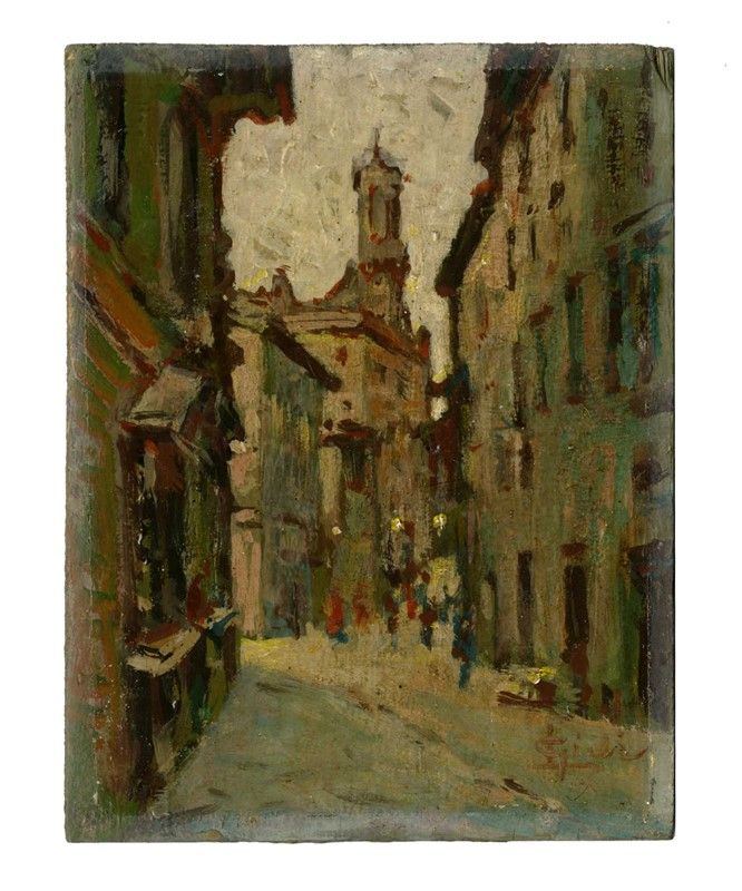 Olio su tavoletta. Iscrizione recante il nome dell'artista in basso a destra. Ulteriore iscrizione con il nome dell'artista ed altri dati illeggibili al verso.