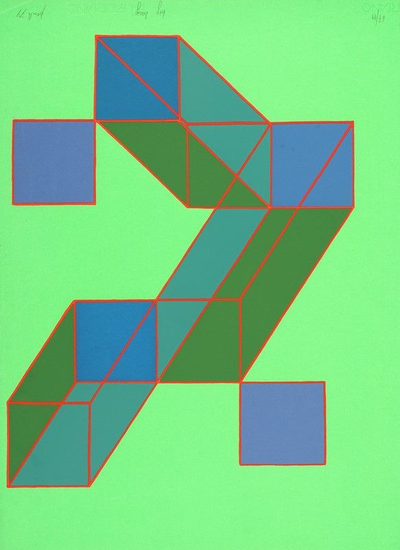 1) Dance. 1979. Litografia a colori. mm 410x430. Foglio: mm 495x555. Firmata e datata a matita in basso a destra, titolata a matita in basso al centro e numerata a matita in basso a sinistra. Timbro a secco di Calcografica Studio in basso a destra. Es. 95/99. 2) Big Bang. 1979. mm 545x410. Foglio: mm 670x495. Firmata e datata a matita in basso a destra, titolata a matita in basso al centro e numerata a matita in basso a sinistra. Timbro a secco di Calcografica Studio in basso a destra. Es. 67/99.