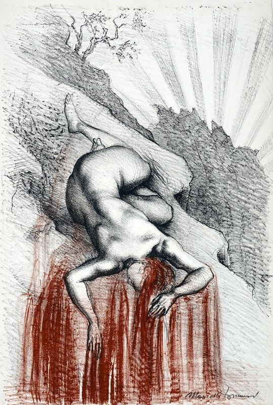 1) Apollo e Dafne. Carboncino e sanguigna su carta greve. mm 760x560. Firmato in basso a destra e dedicato in basso. 2) Senza titolo. Carboncino e sanguigna su carta greve. mm 560x380. Firma in basso a destra. 3) Nudo femminile. Carboncino e sanguigna su carta greve. mm 650x470. Firma in basso a destra e numerazione in basso a sinistra (anche se si tratta di un disegno). Es. 132/150.
