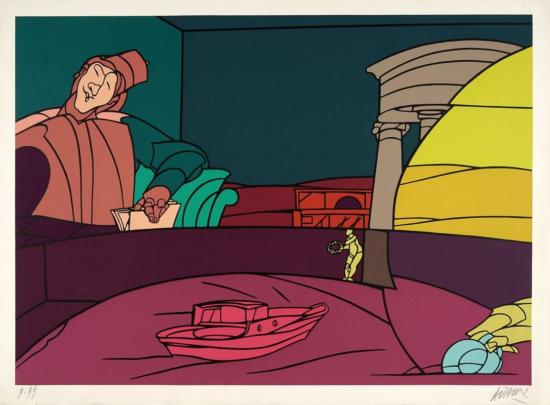 Serigrafia a 20 colori. mm 500x700. Foglio: mm 560x750. Firma a matita in basso a destra e numerazione in basso a sinistra, ovvero 9.99. Conservata nella sua cartella editoriale originale.