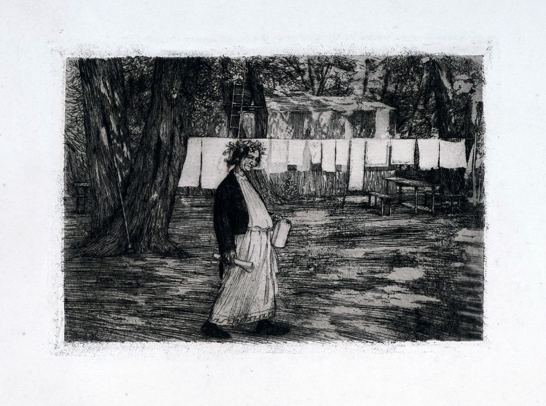 Acquaforte. mm 290x260. Foglio: mm 360x300. Timbro e firma a matita in basso a destra. In basso al centro annotata a matita: "Epreuve de presentation". In basso a sinistra remarque con vignetta incisa di Palazzo Vendramin, Venezia. Prova di presentazione. La tiratura ufficiale fu di 60 esemplari. Si aggiungono: Max Feldbauer, Diana, 1895. Acquaforte. mm mm 132x290. Foglio: mm 435x560. Eugen Kirchner, Procul negotiis, 1894. Acquaforte. mm 130x190. Foglio: mm 450x560. Edite entrambe da Verein für Original-Radirung in München.