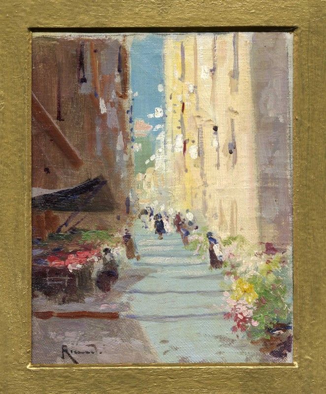 Olio su tela. cm 14,5x11,4 (visibile). Firma in basso a sinistra. Iscritto: "Oscar Ricciardi" a matita al verso dell'opera.