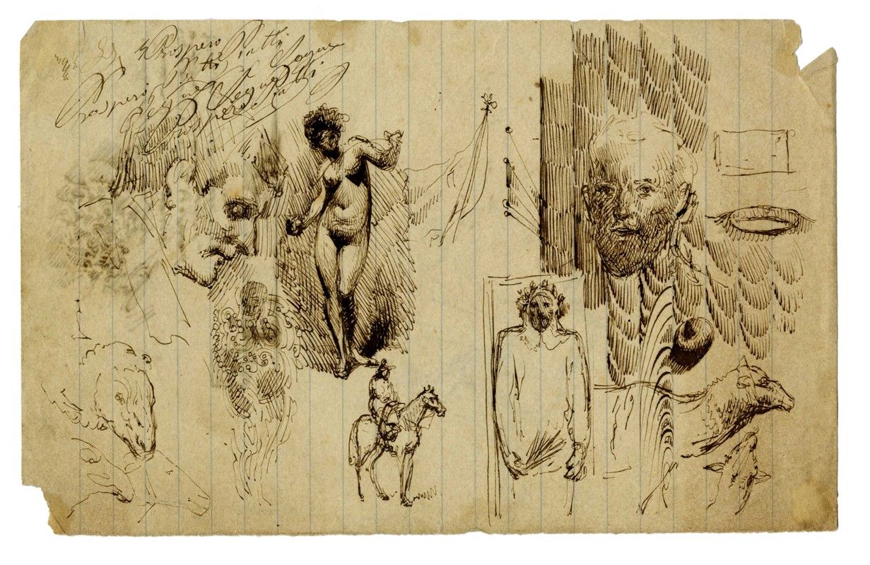 Penna e inchiostro di china bruno su pagina di taccuino. mm 135x210. Firma dell'artista in alto a sinistra con varie annotazioni sparse su tutta l'opera. Ulteriori schizzi e appunti al verso.