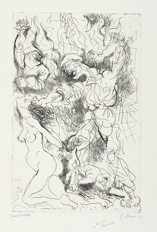 Acquaforte. mm 410x265. Foglio: mm 500x350. Firmato, dedicato e datato a penna e inchiostro di china blu in basso a destra, iscritto: "(Prova d'artista)" in basso a sinistra.
