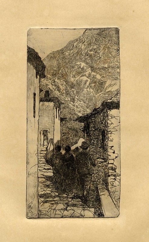 Acquaforte su zinco. mm 178x89. Foglio: mm 370x247. Baboni-malesci, XXIV. Bonagura, 11. Franconi, 16. Timpanaro, 8. Firmata sulla lastra in basso a sinistra. Conosciuta anche con i titoli, Montagna Pistoiese, Tre figure in una strada di montagna e Paese Toscano. Esemplare in tiratura coeva.