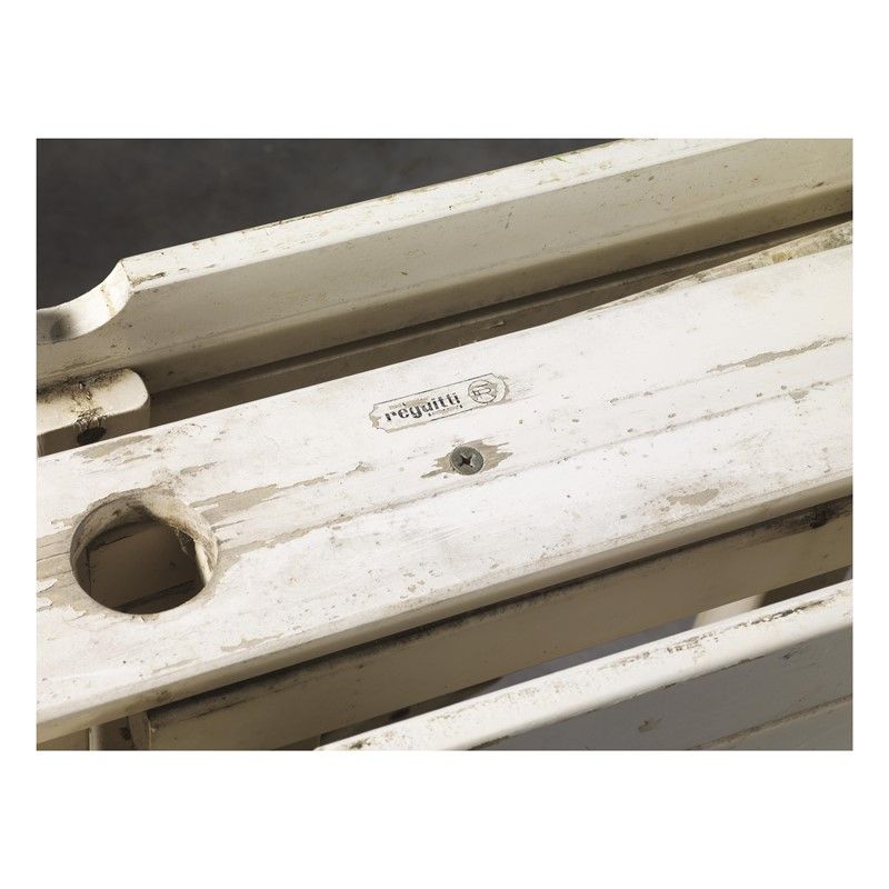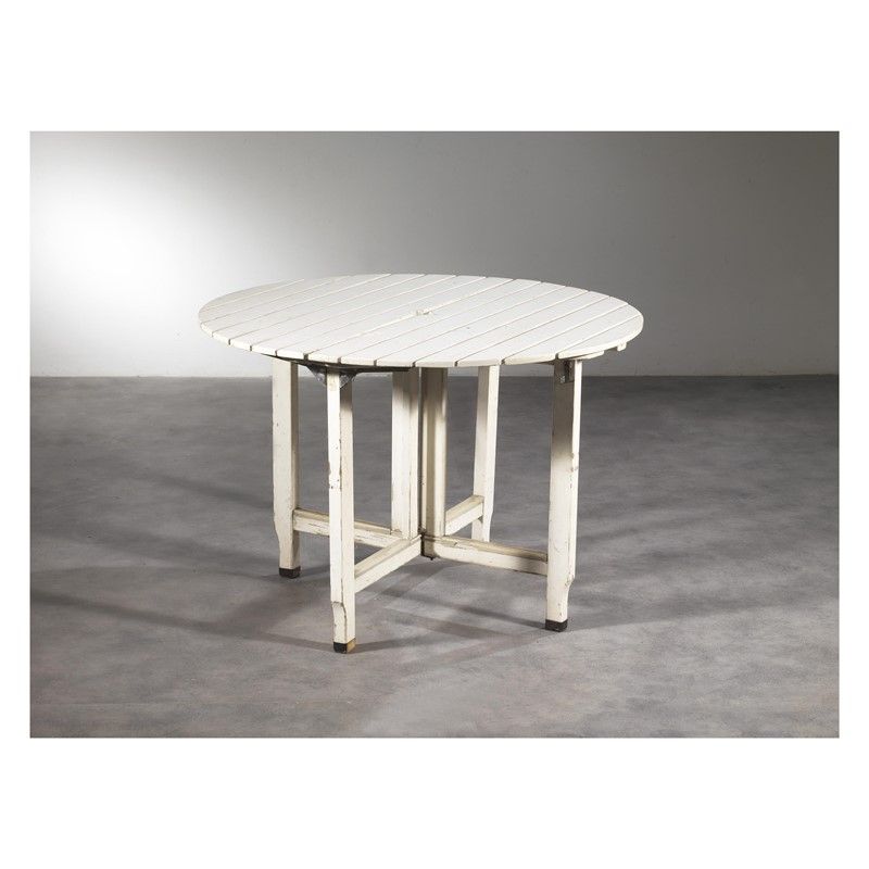 Carlo Hauner (Brescia, 1927 - Salina, 1996) SET DA GIARDINO DELLA SERIE CALIFORNIA composto da quattro poltroncine ed un tavolo pieghevole in legno laccato bianco Adesivo del produttore sul tavolo Produzione Fratelli Reguitti, Italia, 1970 tavolo alt. cm 70 diam. cm 101,5 poltroncine cm H73xL75x71