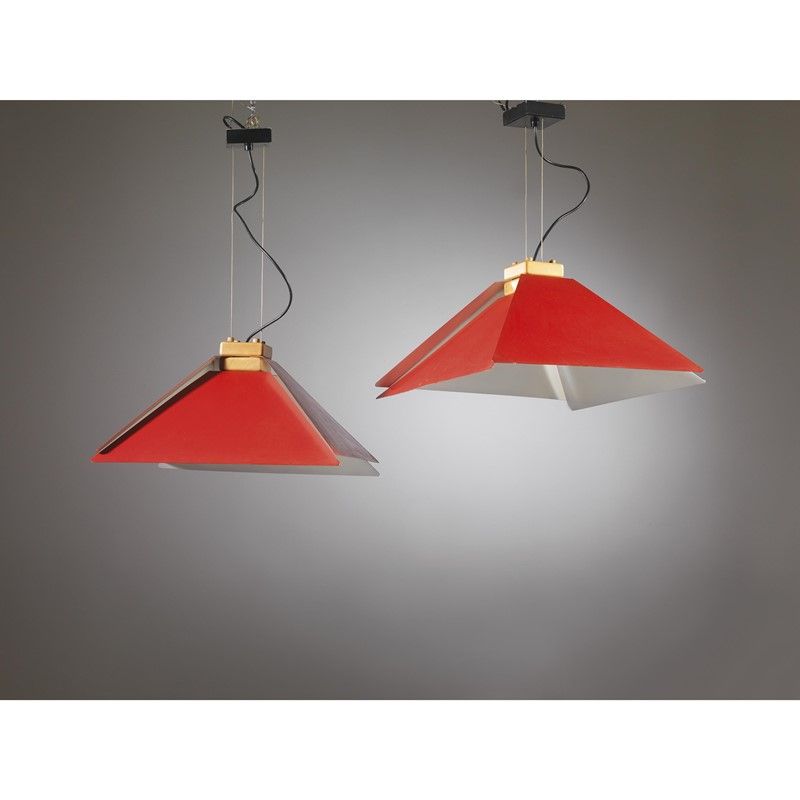 De Pas, D’Urbino, Lomazzi DUE LAMPADE A SOSPENSIONE MODELLO a558 KAZUKO struttura in legno, metallo laccato nei toni del rosso Produzione Candle, 1970 circa Cm H40xL53xP53