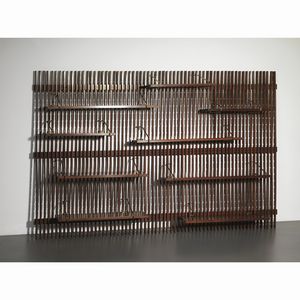 Pietro Saccardi (XX sec.) LIBRERIA MODULARE A SOSPENSIONE struttura in legno e dettagli metallici Produzione [..]