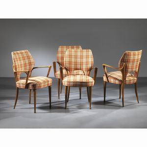 QUATTRO SEDIE struttura in legno, imbottite e rivestite in tessuto Produzione Italia, 1955 circa cm 90x60x58 [..]