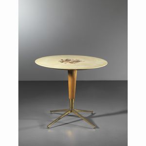 TAVOLO TONDO in legno, ripiano ad intarsio in radica Produzione Italia, 1955 circa diam. cm 127 e cm alt. 77 [..]
