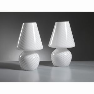 DUE LAMPADE DA TAVOLO in vetro nei toni del bianco Produzione Italia, 1980 circa alt. cm 31 TWO TABLES LAMPS, [..]