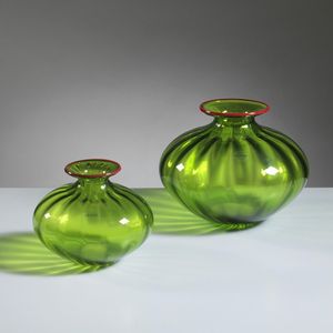 Venini COPPIA DI VASI MODELLO BALLOTON in vetro nei toni del verde e bordo superiore nei toni del rosso Marchiato [..]