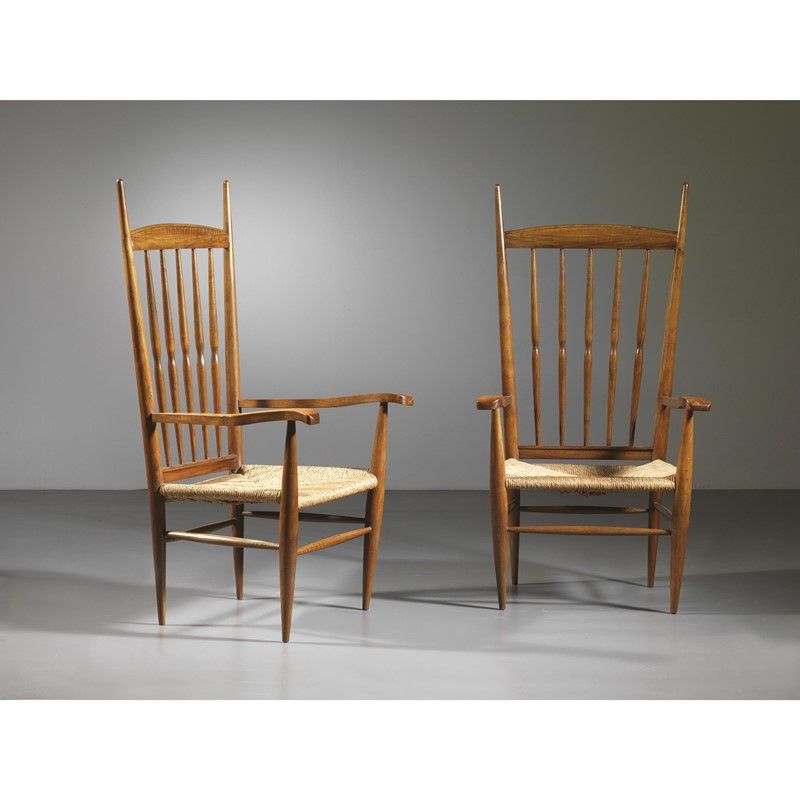 TWO WOODEN ARMCHAIRS, STRAW SEAT
