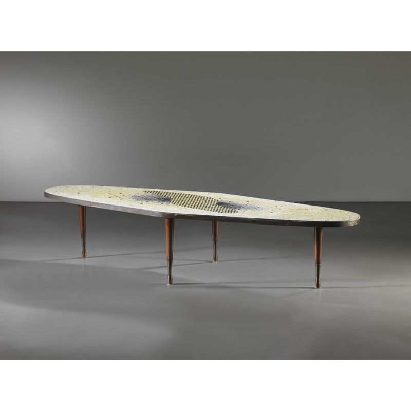 struttura in legno, ripiano mosaicato, dettagli in metallo