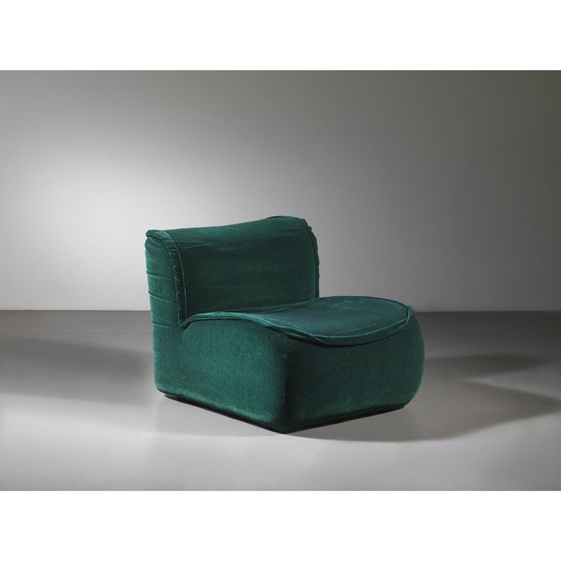 Giudici (XX sec.) CINQUE POLTRONE MODULARI MODELLO CALIDA struttura in legno e plastica, imbottite e rivestite in velluto nei toni del verde Produzione Coim, L’Aquila, Italia, 1970 circa Marchio del produttore, modello e autore sul fondo cm 70x73x85