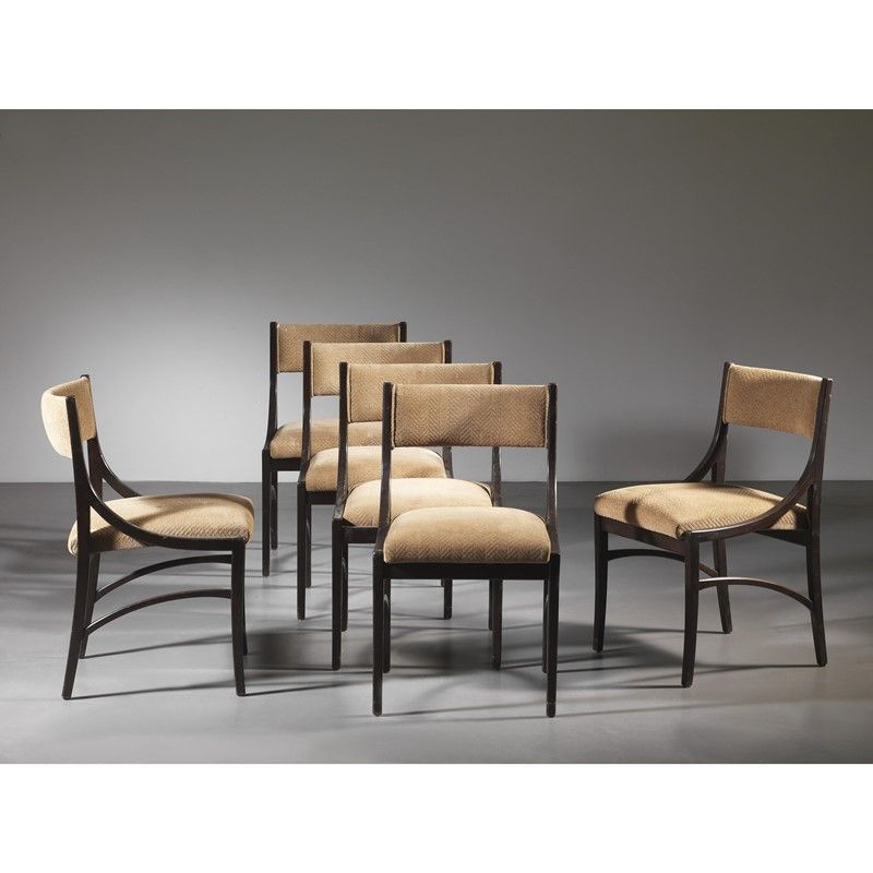 SIX «110» CHAIRS, WOOD STRUCTURE, PADDED AND COVERED WITH BEIGE FABRIC
