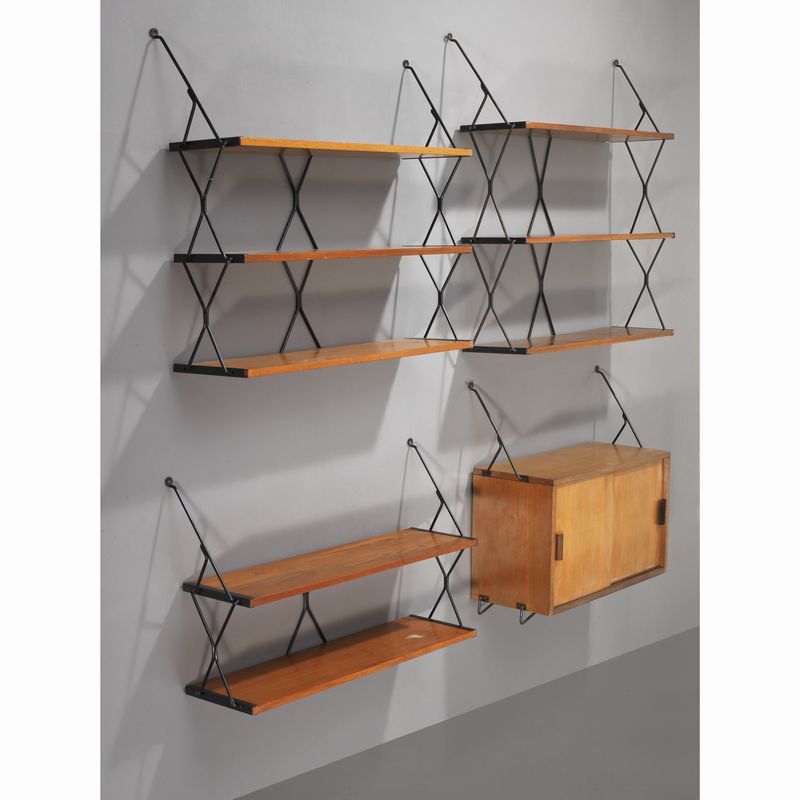 ISA LIBRERIA MODULARE in legno e metallo verniciato nei toni del nero Adesivo del produttore sul retro Produzione Isa Bergamo, Italia, 1955 circa Adesivi del produttore sul retro modulo con sportelli cm H47xL75xP30 modulo a due ripiani cm H57xL92xP26 modulo a tre ripiani cm H82xL92xP26 modulo a tre ripiani cm H97xL92xP26