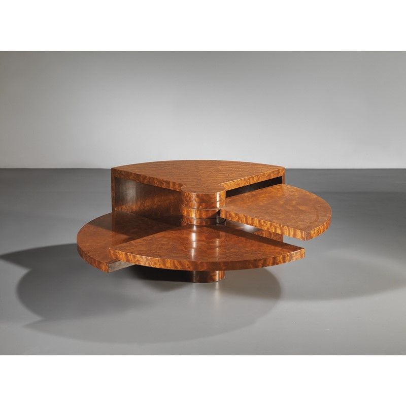Pierre Cardin (San Biagio di Callalta, 1922 - Neuilly-sur-Seine, 2020) TAVOLO BASSO GIREVOLE struttura in legno Produzione Francia, 1970 circa cm H41xL70(118)xP70