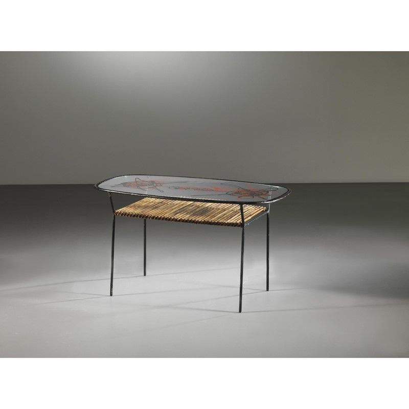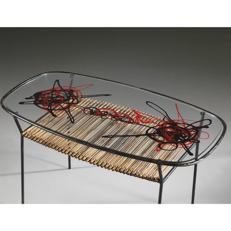 LOW TABLE, METAL AND VIMINI STRUCTURE, GLASS PAINTED TOP