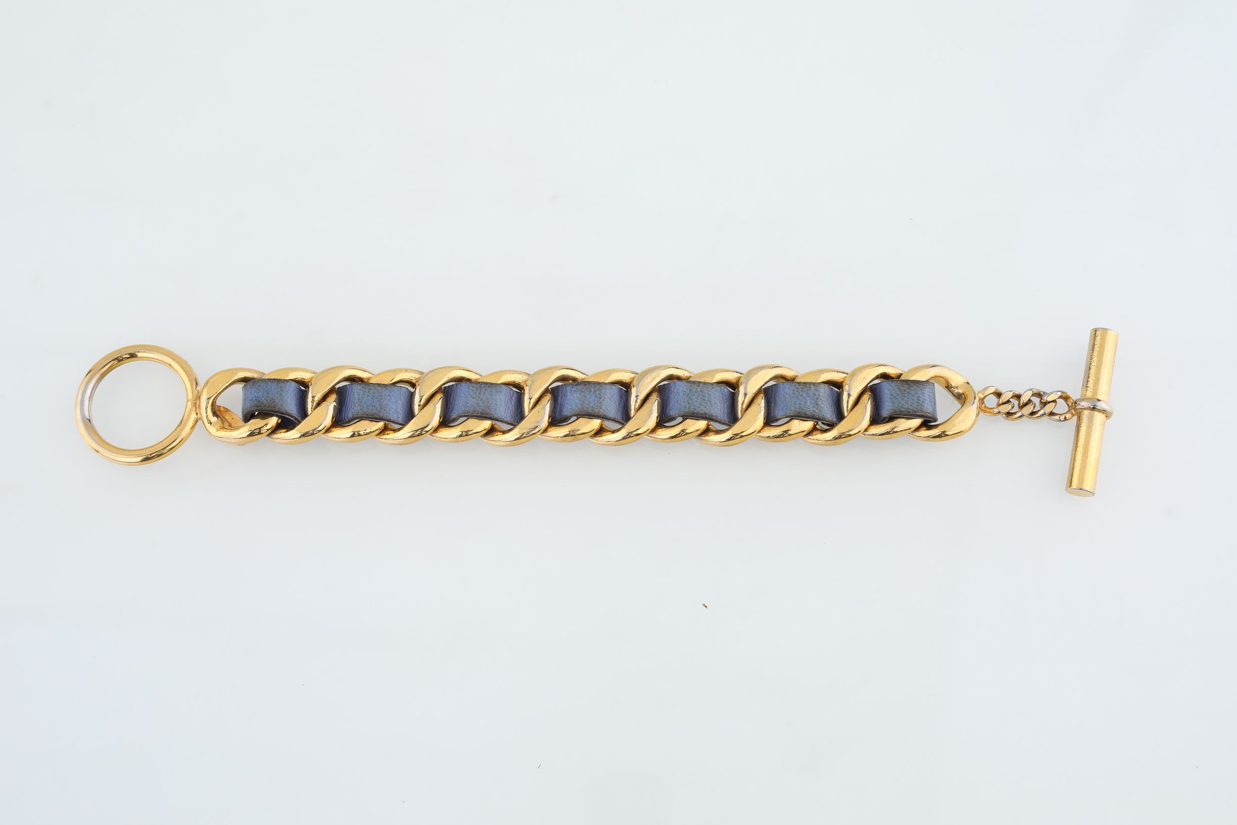 Catena dorata con pelle color carta da zucchero intrecciata. Presenta segni di utilizzo (maggiormente visibile nella pelle).