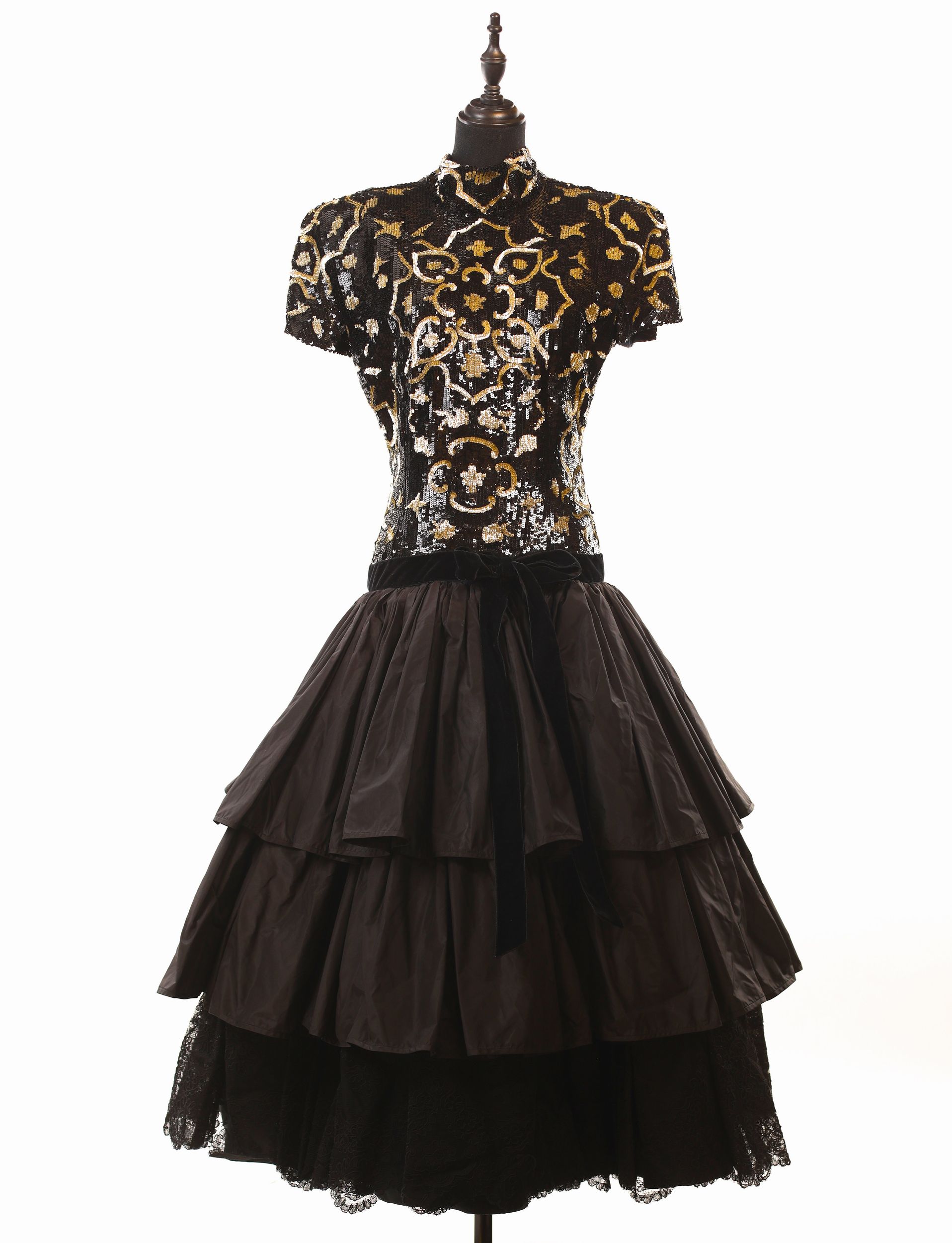 Valentino botique. Busto con paillettes nere e argento. Con spalline. Gonna ampia a balze. Cintura in velluto. Chiusura sul centro dietro con lampo. Con lieve difetto.