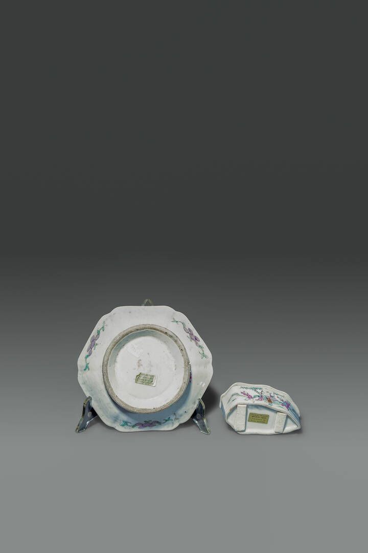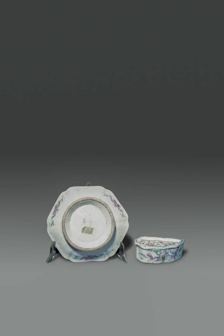 Alzata e incensiere in porcellana Famiglia Rosa Cina dinastia Qing XIX Sec. H cm 4 5x19 5 alzata H cm 13x6 5 incensiere