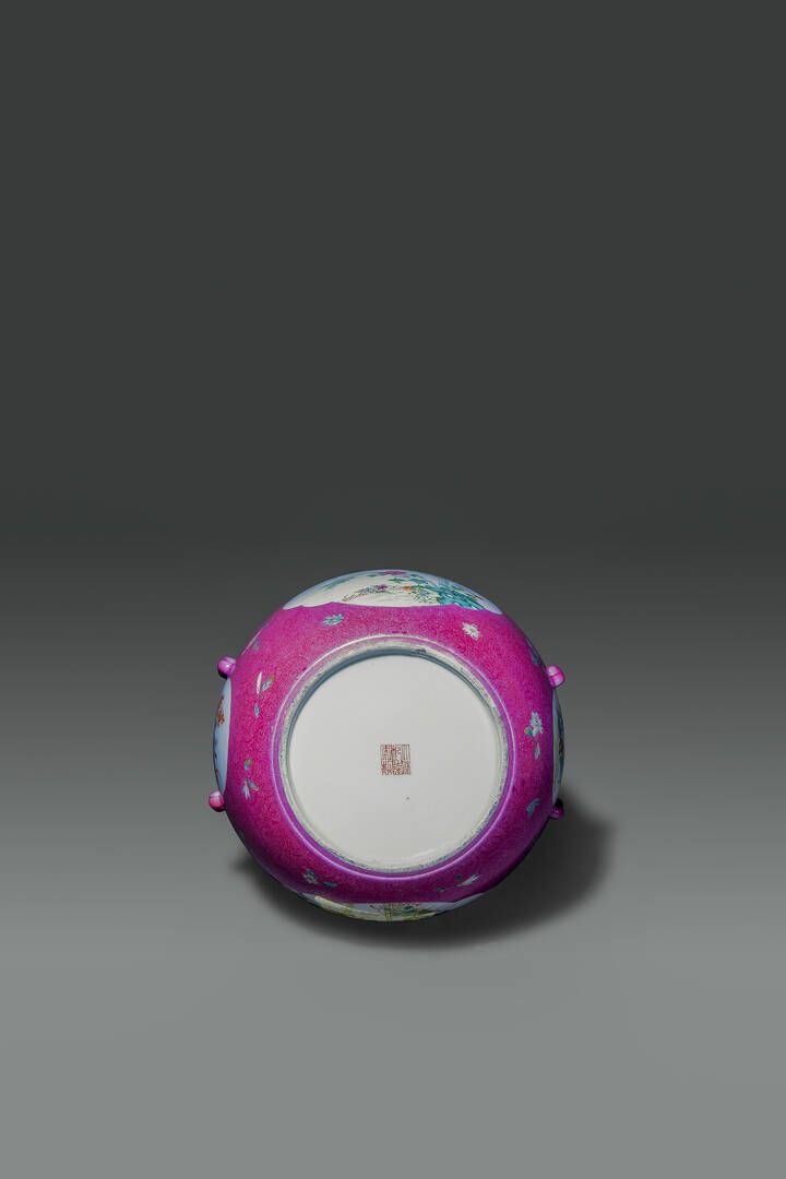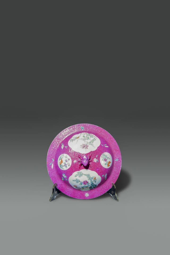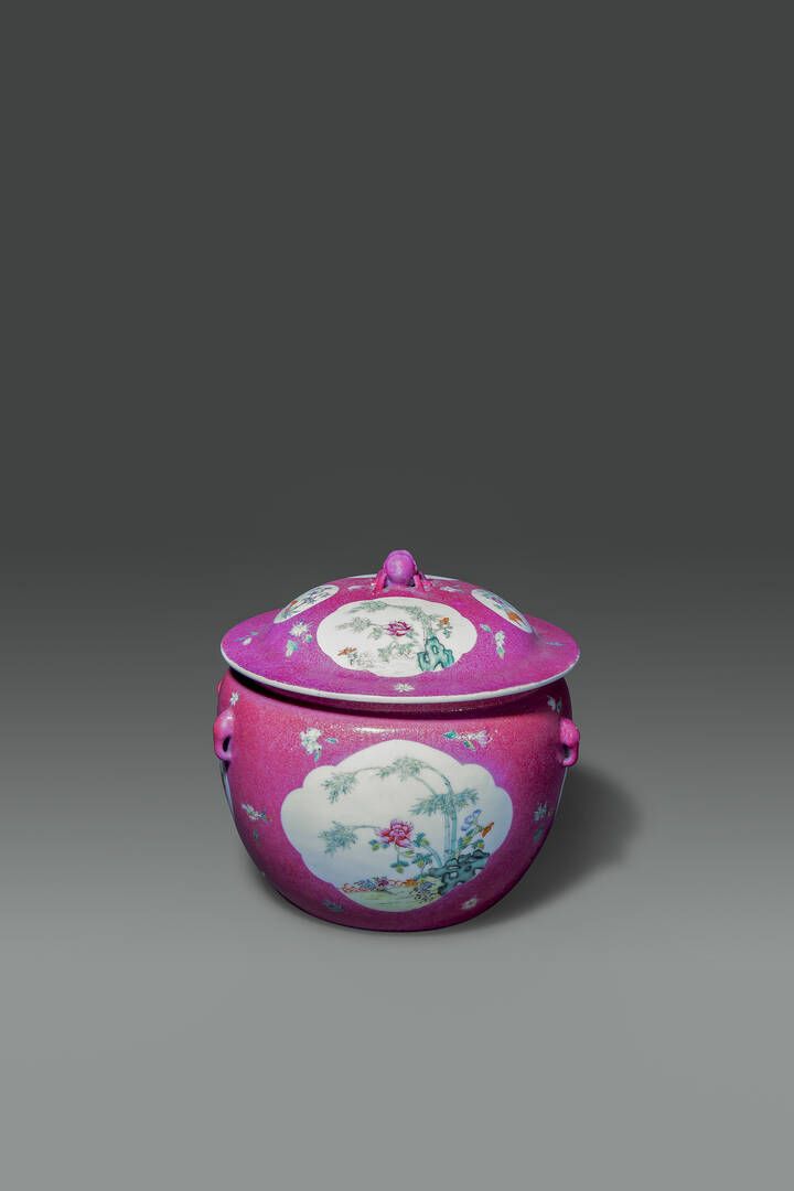 Cachepot con tappo Famiglia Rosa con decori floreali entro riserve su fondo rosa Cina Repubblica XX Sec. H cm 23x22