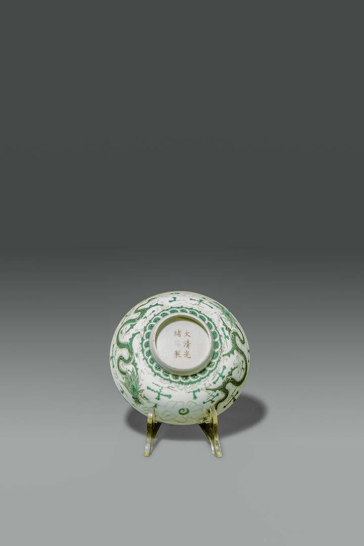 Ciotola in porcellana Famiglia Verde con figure di draghi tra le nuvole Cina dinastia Qing epoca Guangxu (1875-1908) H cm 6 Diam cm 16