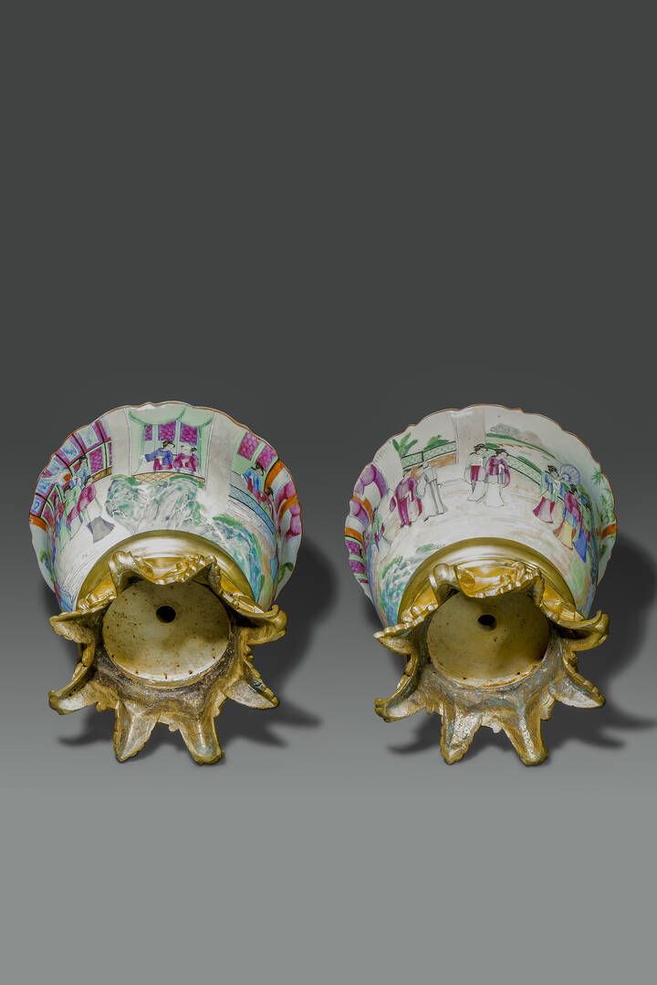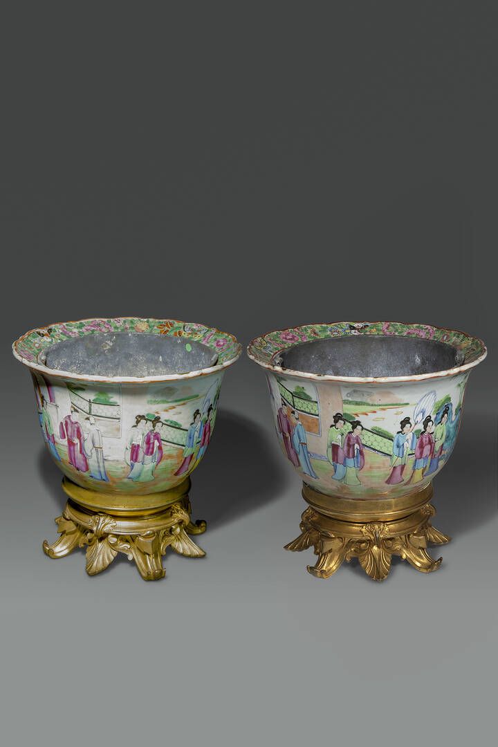 Coppia di giardiniere in porcellana Canton montate su bronzo dorato Cina dinastia Qing XIX sec H cm 26 Diam cm 27.5