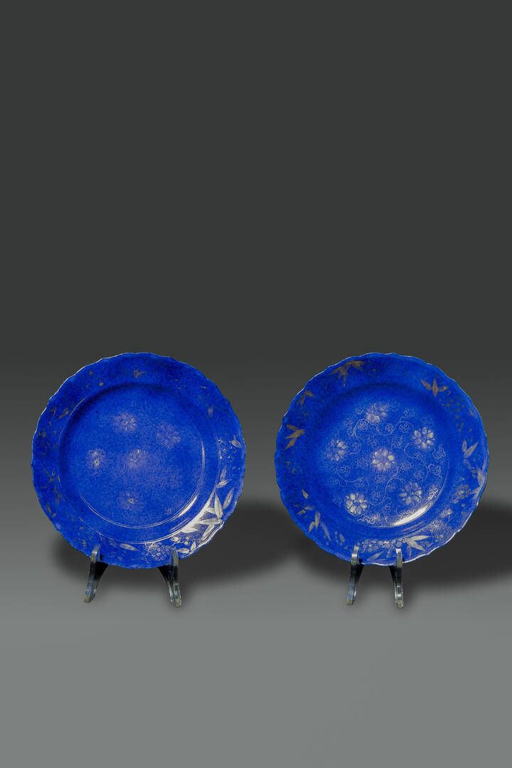 Coppia di piatti in porcellana blu cobalto con lumeggiature in oro floreali Cina [..]