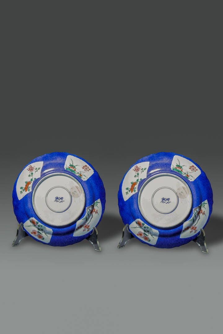 Coppia di piatti in porcellana blu cobalto con lumeggiature in oro floreali Cina dinastia Qing epoca Kangxi (1662-1722) Diam cm 21
