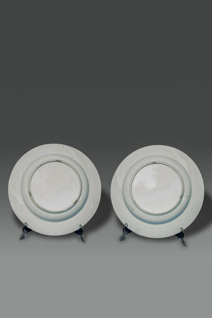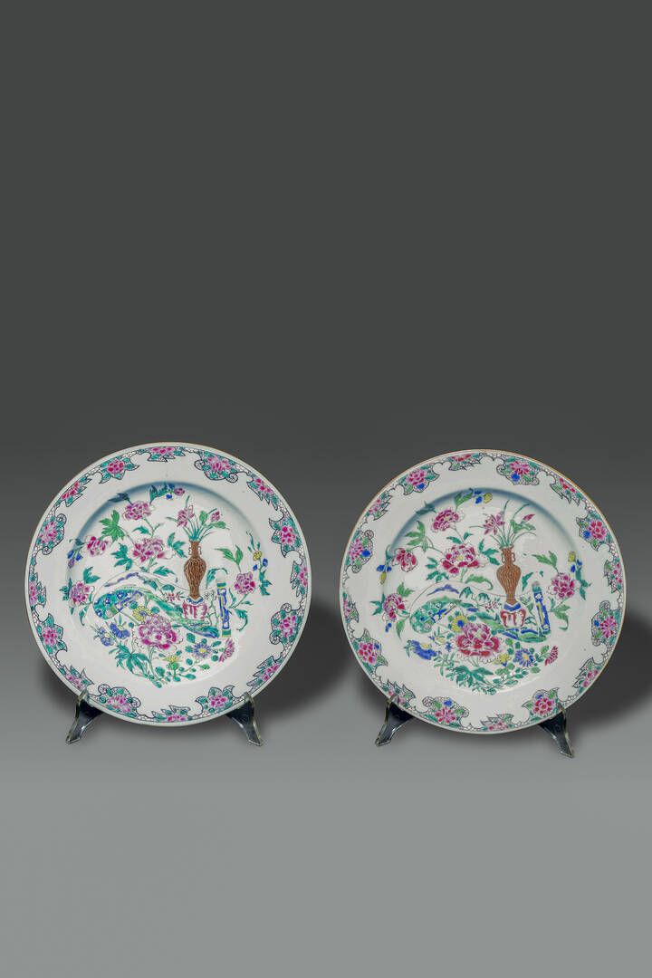 Coppia di piatti in porcellana Famiglia Rosa con decori floreali e soggetti naturalistici [..]