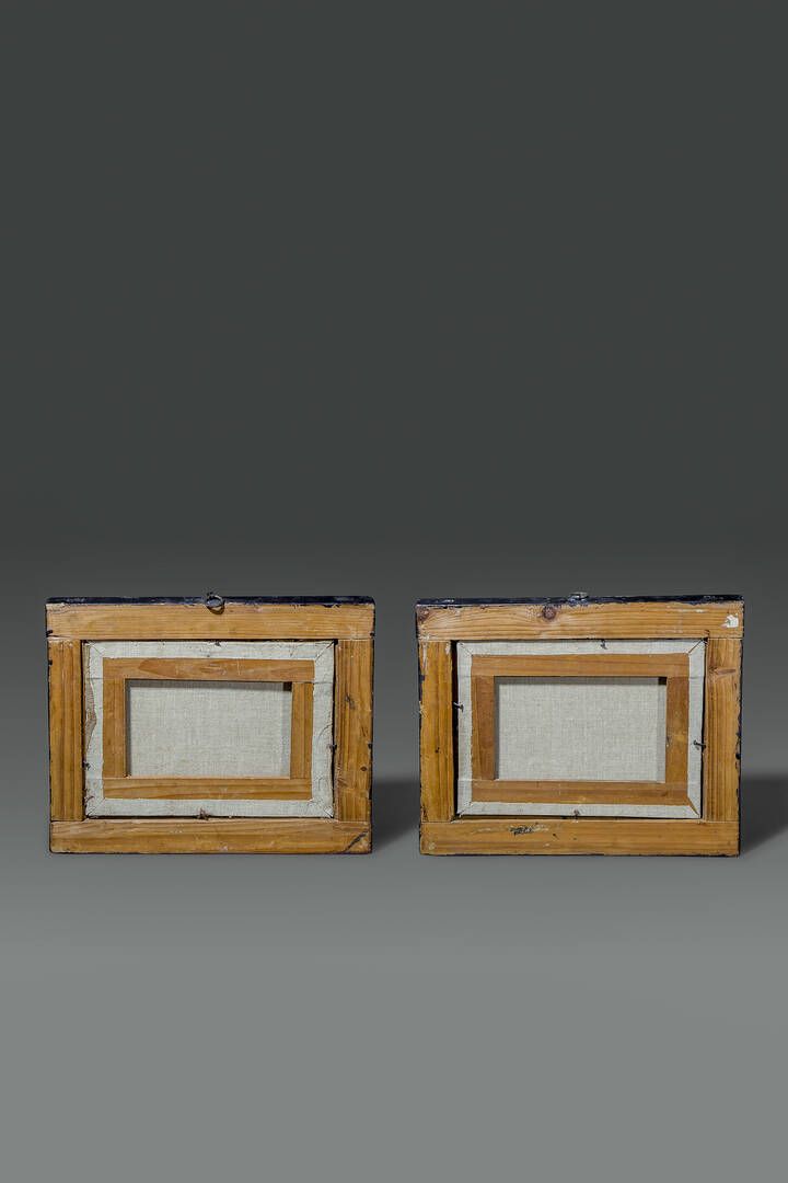 Coppia di quadretti olio su tela finemente dipinti con scene di pesca Cina dinastia Qing XVIII sec. H cm 20x15