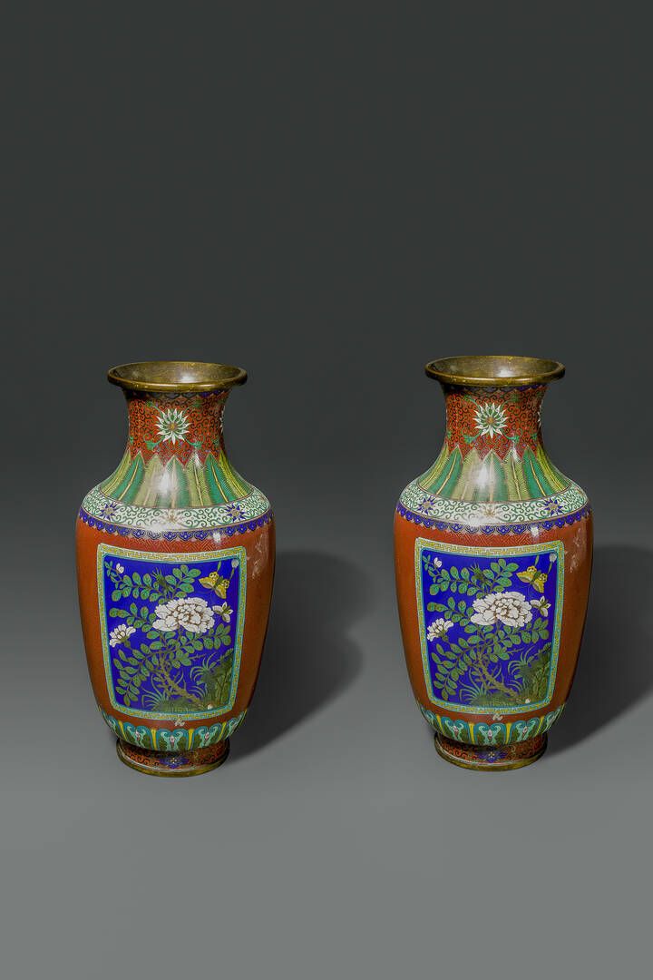 Coppia di vasi cloisonne su sfondo rosso con decori floreali entro riserve Cina Repubblica XX sec H cm 38 Diam cm 19
