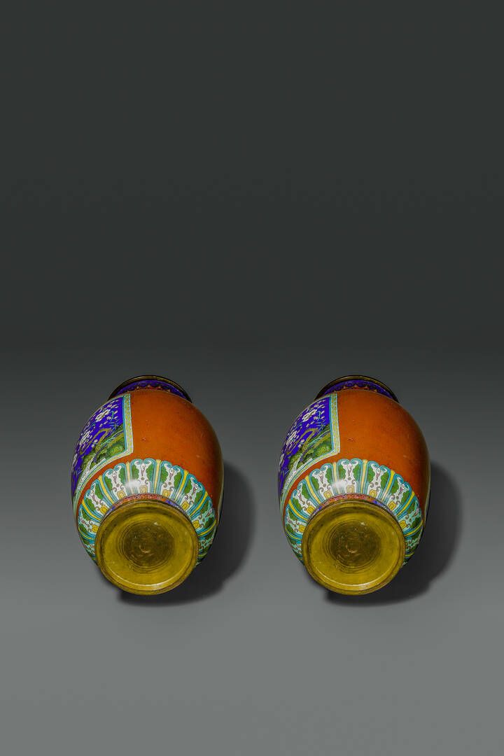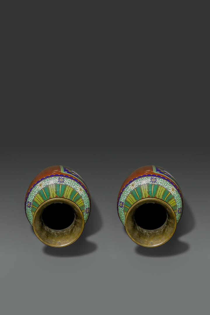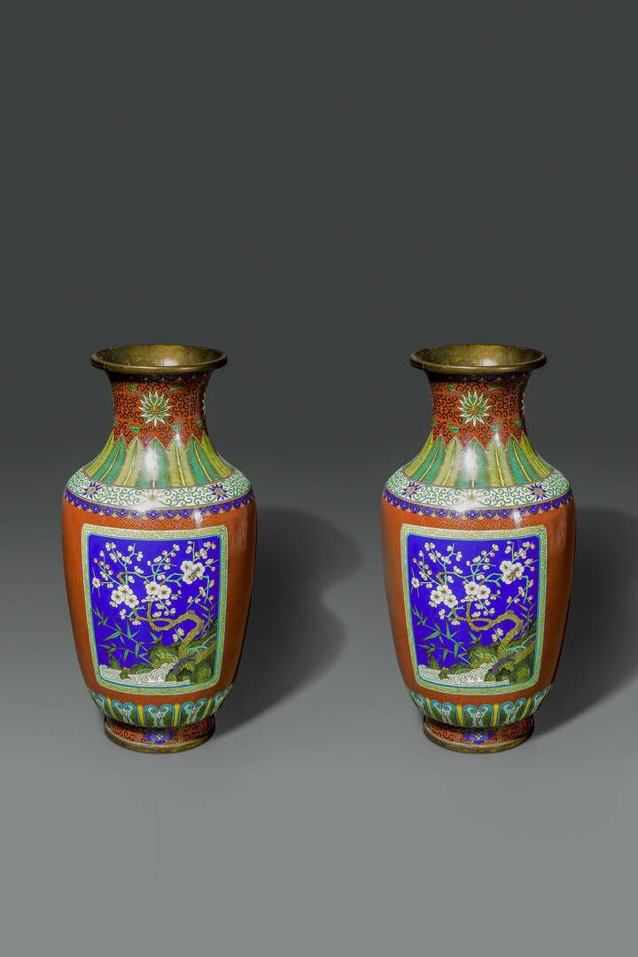 Coppia di vasi cloisonne su sfondo rosso con decori floreali entro riserve Cina [..]